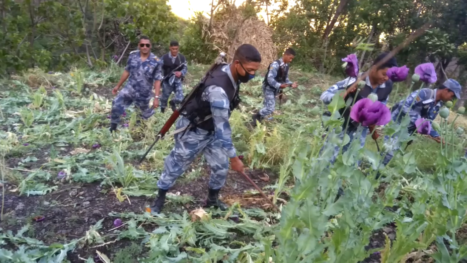 सशस्त्र प्रहरी बलबाट आठविसकाेट न पा को ठुलिवार्खुमा २०७५ साल चैत २६ गते अफिम खेती नष्ट गर्दै