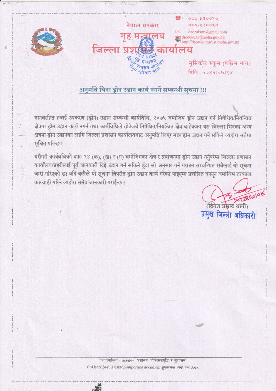 तस्बिर : अनुमति बिना ड्रोन उडान कार्य नगर्ने सम्बन्धी सूचना !!!