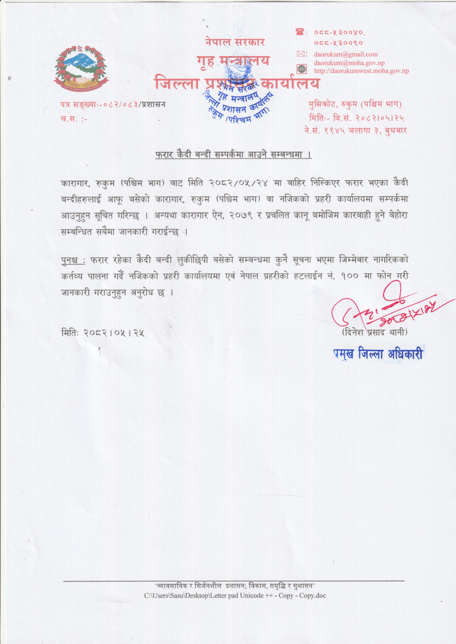 © सर्वाधिकार सुरक्षित जिल्ला प्रशासन कार्यालय, रुकुम (पश्चिम भाग) .