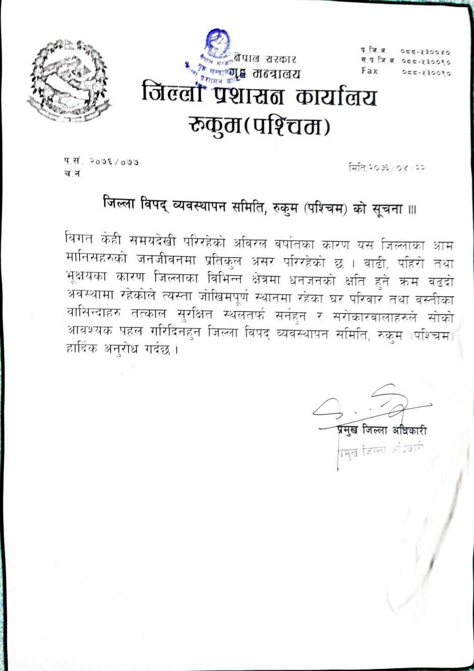 जिल्ला विपद् व्यवस्थापन समिति रुकुम पश्चिमकाे सूचना