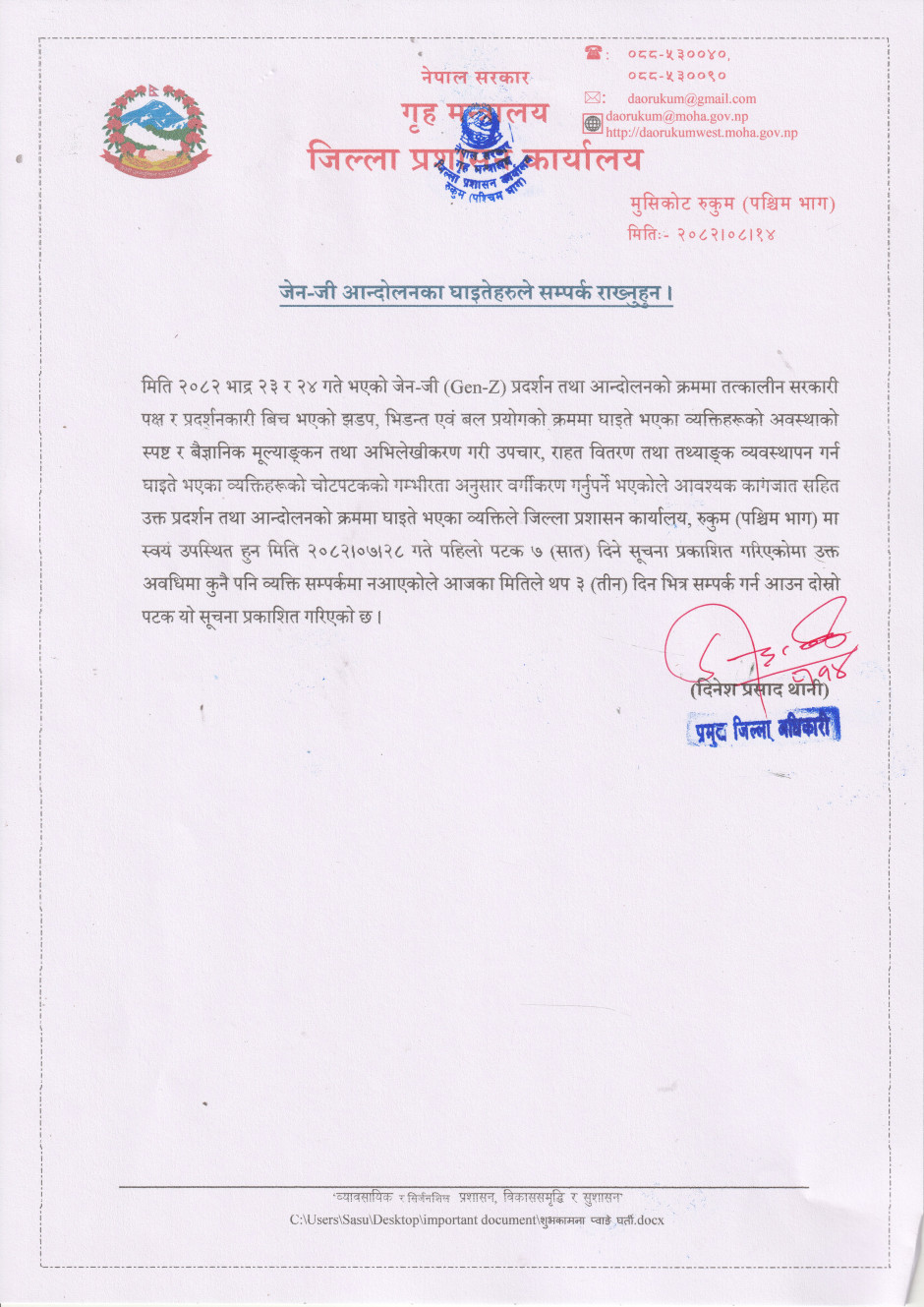 © सर्वाधिकार सुरक्षित जिल्ला प्रशासन कार्यालय, रुकुम (पश्चिम भाग) .