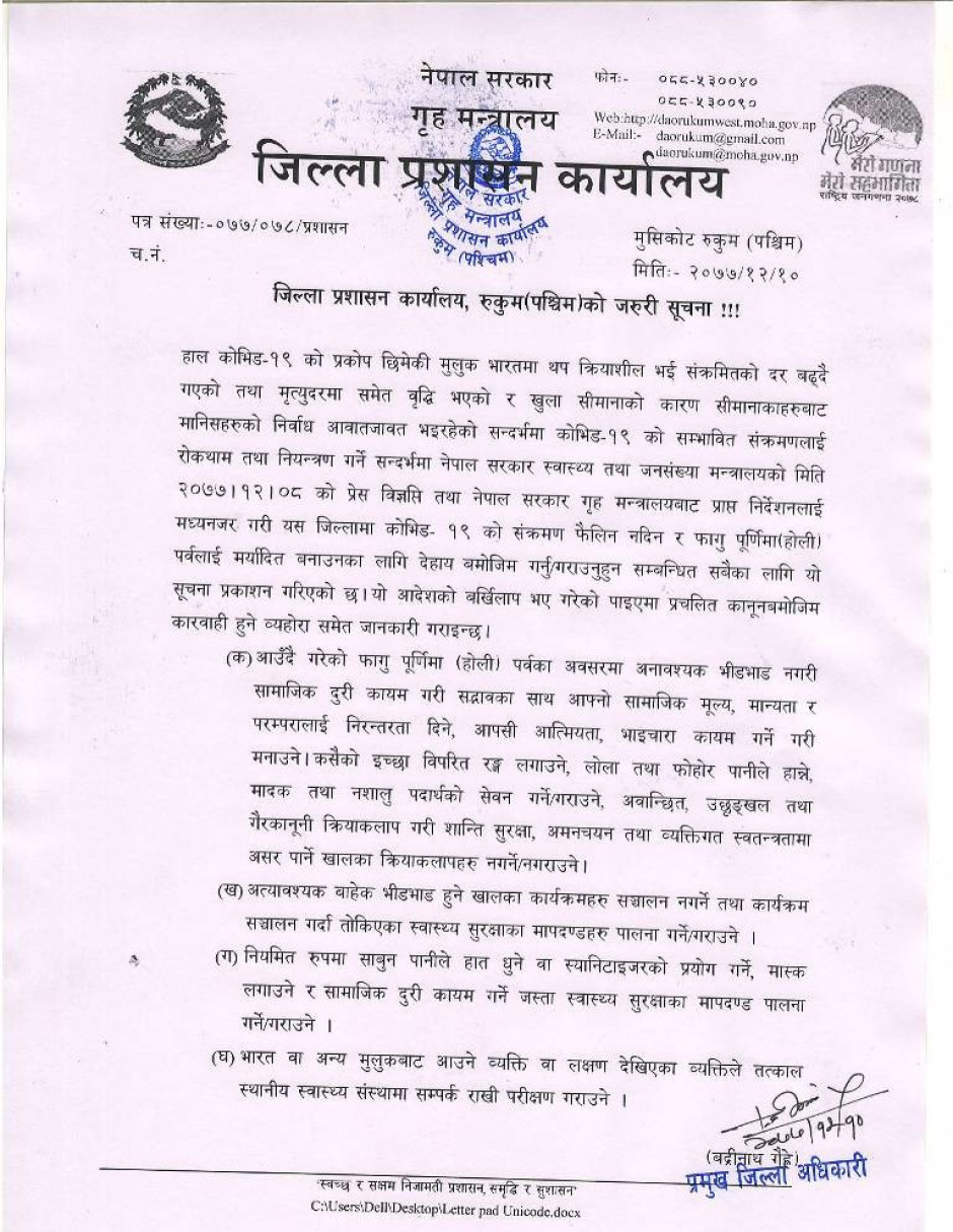 © सर्वाधिकार सुरक्षित जिल्ला प्रशासन कार्यालय, रुकुम (पश्चिम भाग)