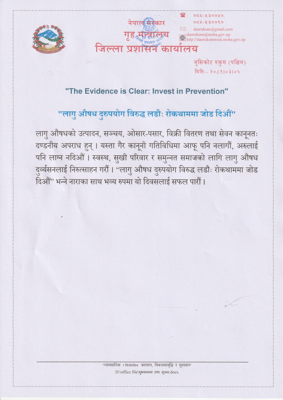 तस्बिर : "लागु औषध दुरुपयोग विरुद्ध लडौः रोकथाममा जोड दिऔं"