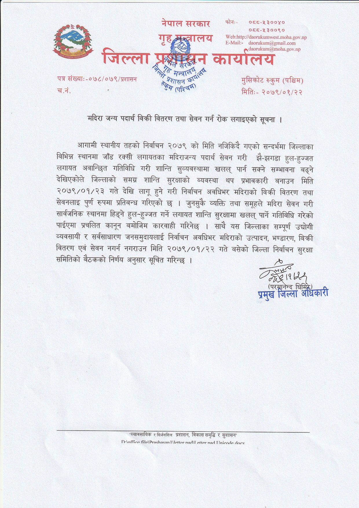 मदिरा बिक्री-वितरण निषेध गरिएको सम्बन्धमा अत्यन्त जरुरी सूचना ।