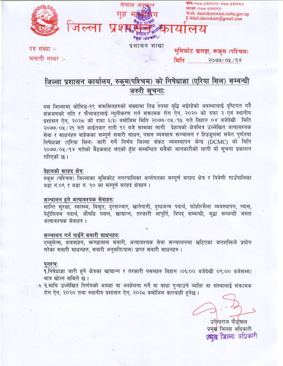 निषेधाज्ञा तथा एरिया सिल गरिएको सम्वन्धी मिति २०७७-०५-१४ गतेको सूचना