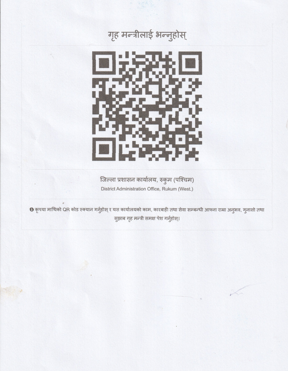 तस्बिर : QR कोड स्क्यान गरी यस कार्यालयको काम, कारबाही तथा सेवा सम्बन्धी आफ्ना राम्रा अनुभव, गुनासो तथा सुझाव गृहमन्त्री समक्ष पेश गर्नुहोस् ।