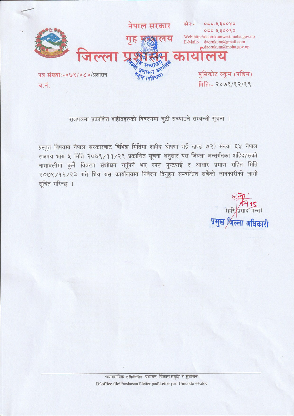 राजपत्रमा प्रकाशित शहीदहरुको विवरणमा त्रुटी सच्याउने सम्वन्धी सूचना ।