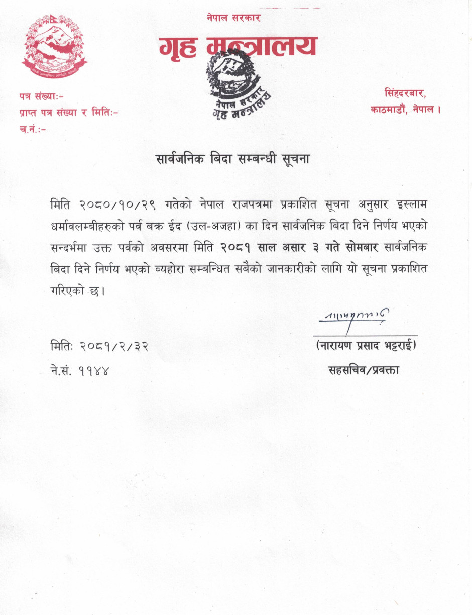 तस्बिर : सार्वजनिक बिदा सम्बन्धी सूचना।