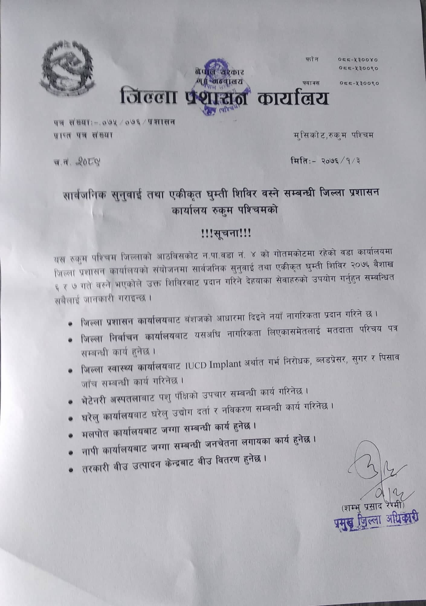 सार्वजनिक सुनुवाइ तथा घुम्तीशिविर (गाेतामकाेटमा )सञ्चालन सम्बन्धी सूचना