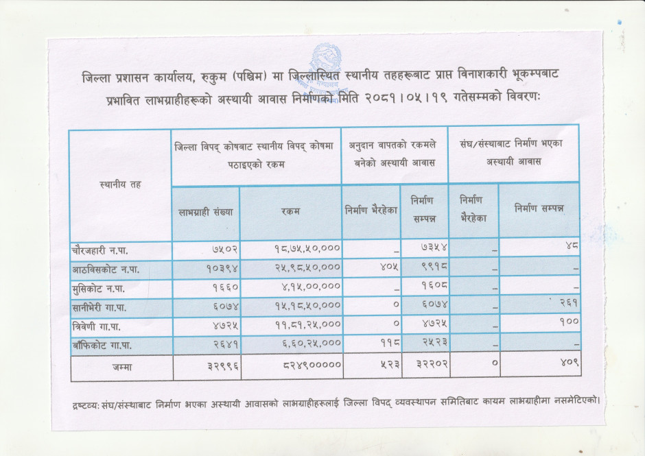 तस्बिर : विनाशकारी भूकम्पबाट प्रभावित लाभग्राहीहरुको अस्थायी आवास निर्माणको मिति २०८१।०५।१९ गतेसम्मको विवरण।