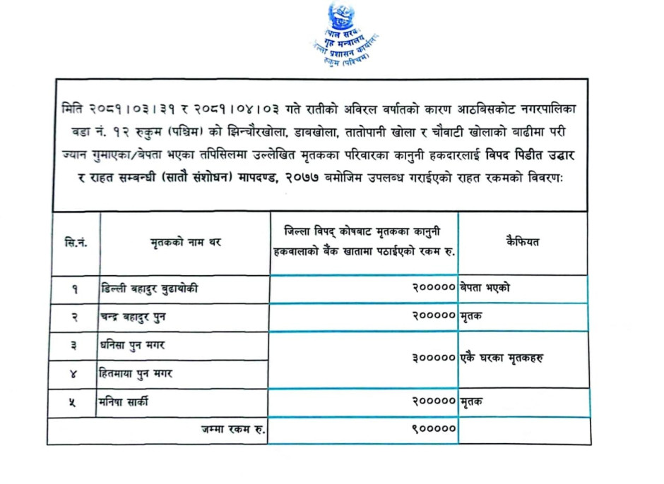 तस्बिर : विपद् पिडित उद्धार र राहत सम्बन्धी (सातौं संशोधन) मापदण्ड, २०७७ बमोजिम वितरण गरिएको राहत वितरण सम्बन्धी विवरण
